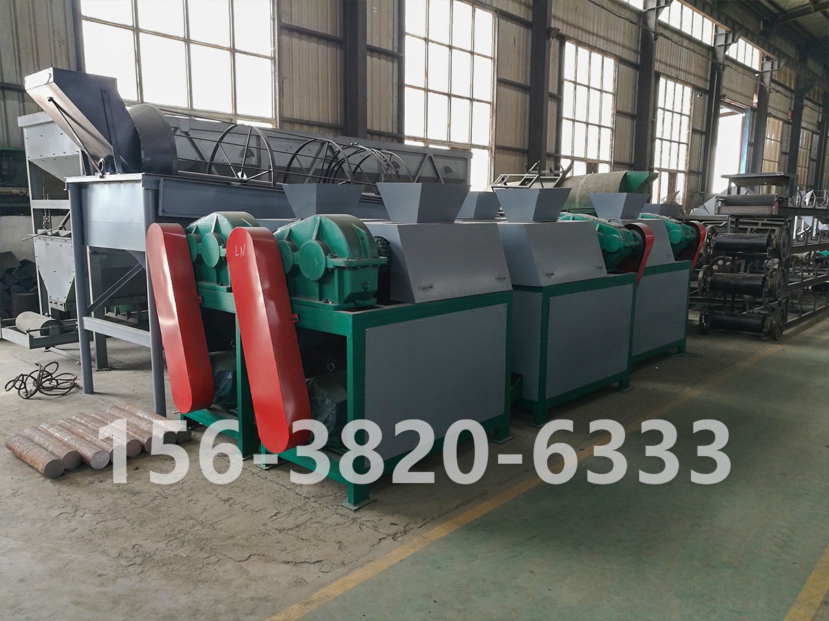 原料經(jīng)定量加料器均勻送入喂料斗, 壓實機利用帶有穴眼孔的成對軋輥,彼此留有一定間隙,兩者以相同的轉(zhuǎn)速作反向旋轉(zhuǎn)。其中一組軋輥軸承座在機架內(nèi)不動,而另一組軋輥軸承座則在機架導(dǎo)軌上游動,藉助液壓缸施壓使彼此緊靠。軋輥表面上有規(guī)則地排列許多形狀、大小相同的穴眼孔,且波谷對準波谷。而此時干粉狀物料從兩軋輥上方連續(xù)均勻地靠自重及強制喂料進入兩軋輥之間,物料先作自由流動,進入咬入?yún)^(qū)后被軋輥逐漸咬入波谷。隨著軋輥的連續(xù)旋轉(zhuǎn),物料占有的空間逐漸減少而被逐步壓縮,并達到成型壓力 值。隨后則壓力逐漸降低,所壓得之型塊因彈性回復(fù)加之自重而脫落穴眼孔而進入碎整粒、篩分裝置,所得成品為粒狀合格產(chǎn)品,進行過秤包裝。而粉料口出來的細粉料和不合格的超大顆粒則由返料絞龍重新進入提升機加料口隨同新鮮物料混合加入預(yù)加料斗而進入下一輪工藝流程。