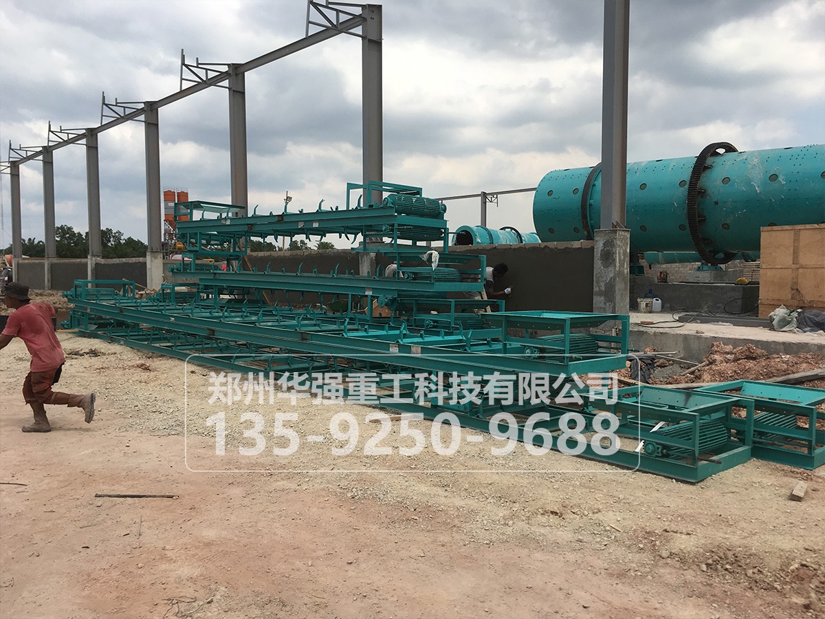 有機(jī)肥原料發(fā)酵腐熟后經(jīng)半濕物料粉碎機(jī)粉碎,在過滾筒篩篩選,把粗料篩出再進(jìn)行發(fā)酵,細(xì)料可進(jìn)行造粒,顆粒外表更漂亮,成粒率更高。 發(fā)酵后物料(水分在35%)經(jīng)攪拌機(jī)摻混后,通過有機(jī)肥造粒機(jī),然后再經(jīng)過有機(jī)肥烘干機(jī)烘干,在通過冷卻機(jī)冷卻,在過滾筒篩分機(jī)篩選,不合格的產(chǎn)品再回?cái)嚢铏C(jī),合格產(chǎn)品在經(jīng)過包膜機(jī),經(jīng)撲粉機(jī)可包鈣、鎂、硫等中微量元素包衣,可經(jīng)料倉(cāng)、包裝機(jī)。